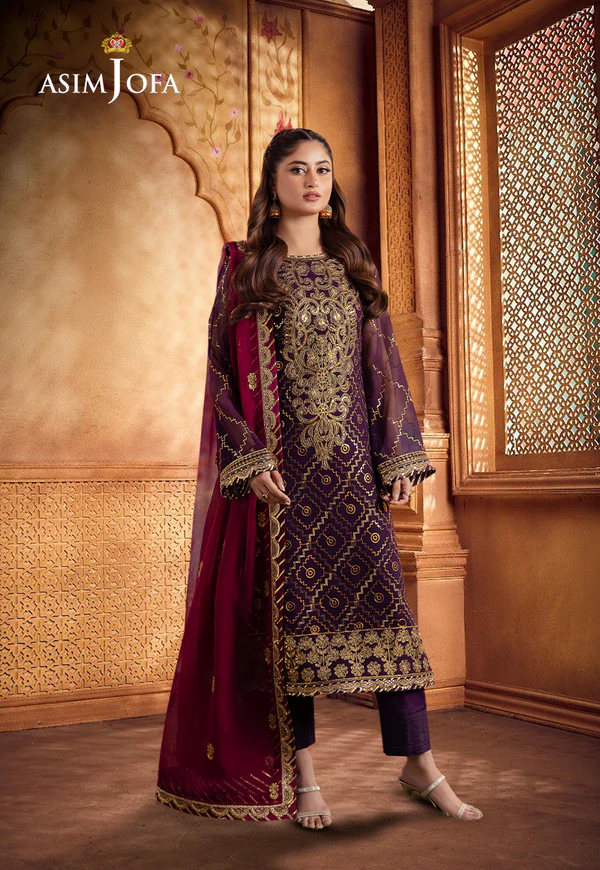 A deep purple hue comes alive with heavy trellis embroidery spread across the shirt done in antique gold zari & glinting sequins topped by a sinuous neckline & floral border. Paired with a lightly embroidered magenta dupatta this design will surely become a new favorite.