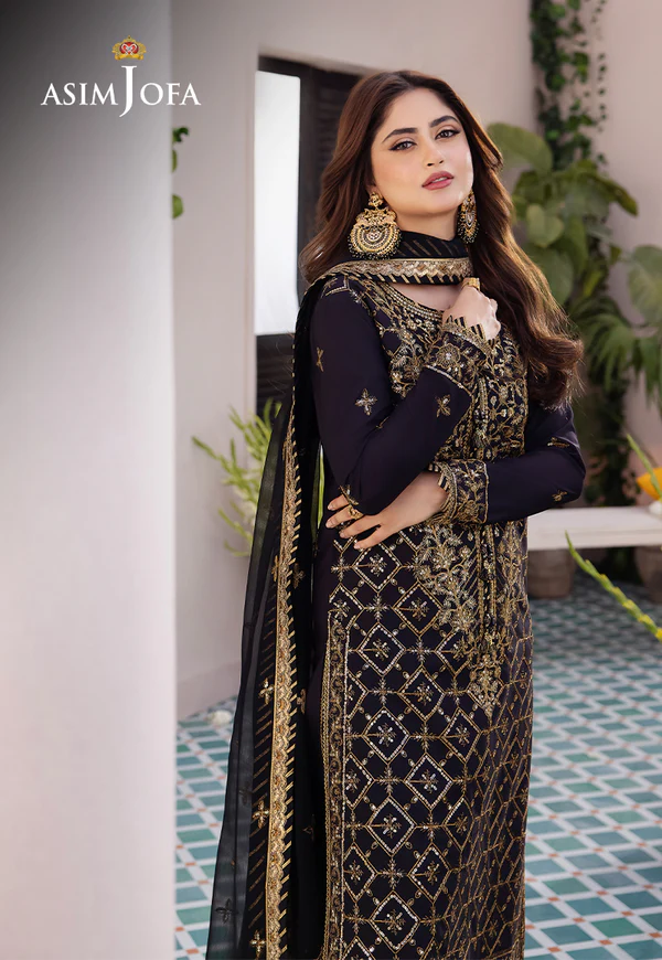 This design boasts a stunning geometric embroidery pattern all over the shirt rendered in antique gold zari & blingy sequins. It is adorned by a heavy neckline & hem border, breaking the monotony of the running design. It comes with an embroidered chiffon dupatta & dyed pants.