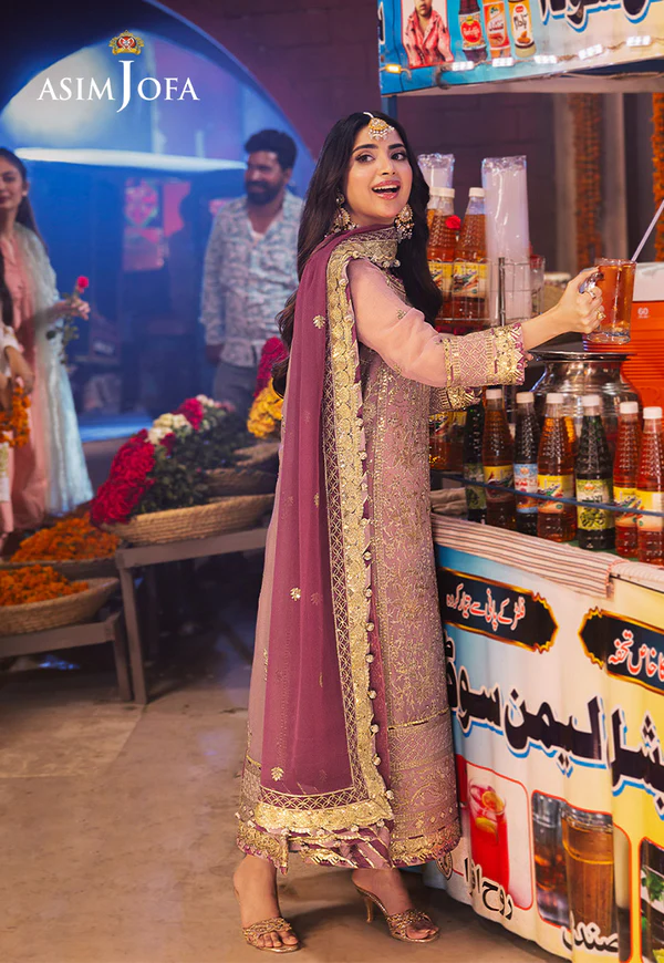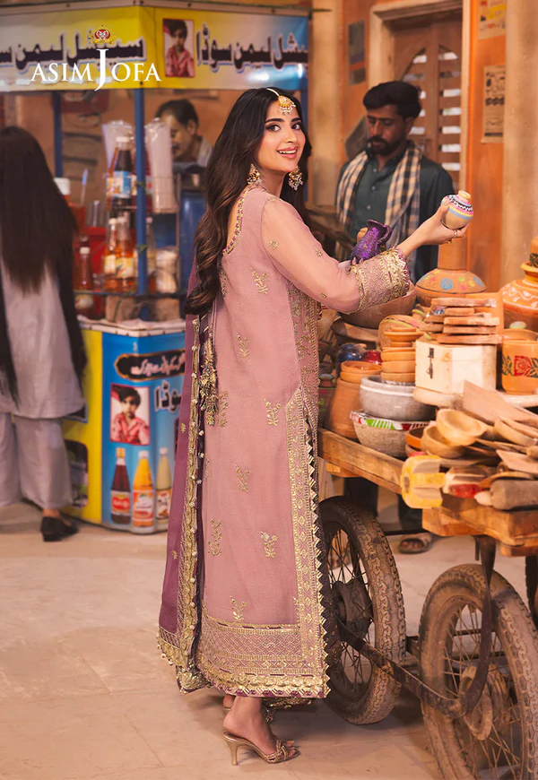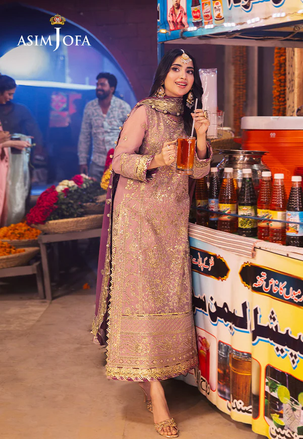 Dress like a blooming blush rose with this tea pink look that whispers of dawn. Light gold and antique gold zari embroidery dance across the stunning shirt, like sunbeams woven into threads. Scattered gold cupped sequins, reminiscent of morning dew clinging to a rose, shimmer with an ethereal glow. The embroidered dupatta, a graceful cascade of delight, completes the look, transforming you into a radiant bloom for your festive soiree.